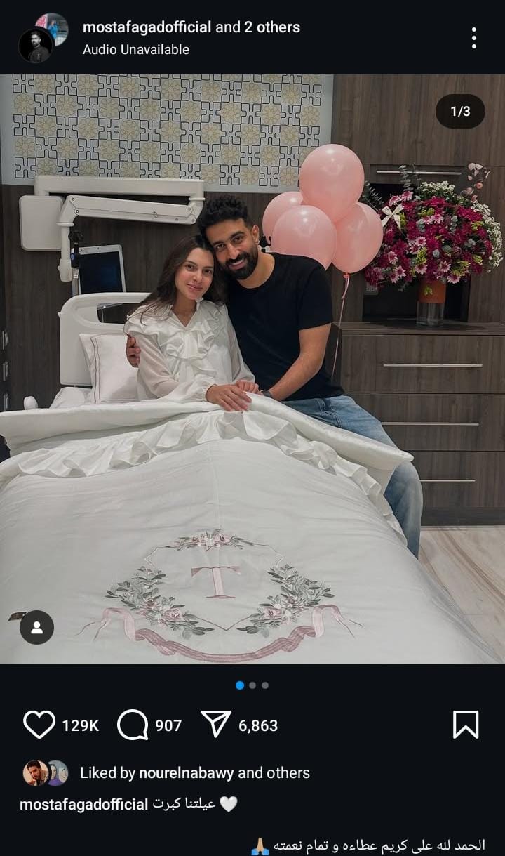 ونشر مصطفي جاد من خلال حسابها الرسمي عبر موقع تبادل الصور والفديوهات القصيرة “إنستجرام” مجموعة من الصور تجمعه بالمطربة كارمن سليمان داخل غرفة بالمستشفي، وعلق: “ عيلتنا كبرت الحمد لله علي كريم عطاءه وتمام نعمته”.