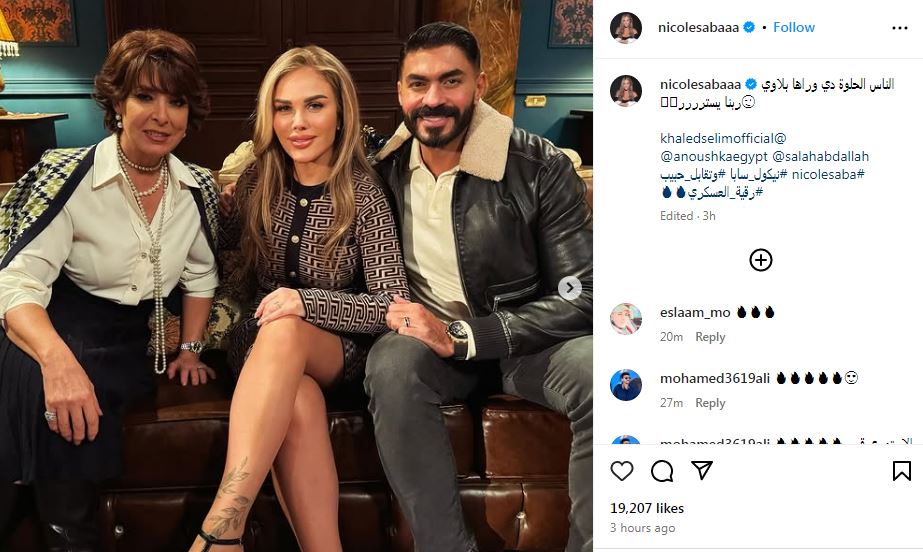 ونشرت نيكول عبر صفحتها الرسمية "إنستجرام" صورة تجمعها بكل من الفنان خالد سليم وانوشكا والنجم صلاح عبد الله "وعلقت عليها " الناس الحلوة دي وراها بلاوي ربنا يستر".