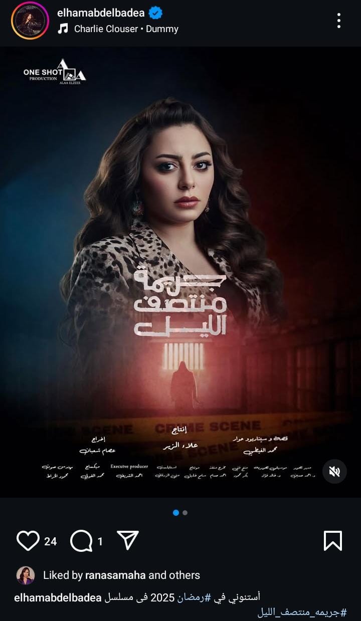 وروجت الفنانة إلهام عبد البديع لـ مسلسل جريمة منتصف الليل بطولة رانيا يوسف، ونشرت إلهام البوستر الفردي لها في المسلسل من خلال حسابها الرسمي عبر موقع تبادل الصور والفديوهات القصيرة "إنستجرام"، وعلقت: “ أستنوني في رمضان 2025 فى مسلسل جريمة منتصف الليل.. رمضان 2025 إنتاج ا/ علاء الزير، منتج فني ا/ بكر محمود، تأليف ا / محمد الغيطي، إخراج ا/ عصام شعبان”.