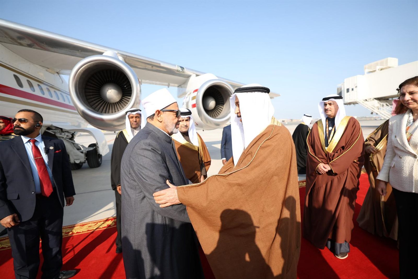 كما تم إقامة مراسم استقبال رسمية لفضيلته فور وصوله مطار البحرين الدولي، حيث كان في استقباله الشيخ عبدالرحمن بن محمد بن راشد آل خليفة، رئيس المجلس الأعلى للشئون الإسلامية، و نواف بن محمد المعاودة، وزير العدل والشؤون الإسلامية والأوقاف، والمستشار محمد عبد السلام، الأمين العام لمجلس حكماء المسلمين، والسفيرة ريهام عبدالحميد، سفيرة مصر لدى مملكة البحرين، وسعادة السيد سلمان بن عيسى بن هندي المناعي، محافظ محافظة المحرق.