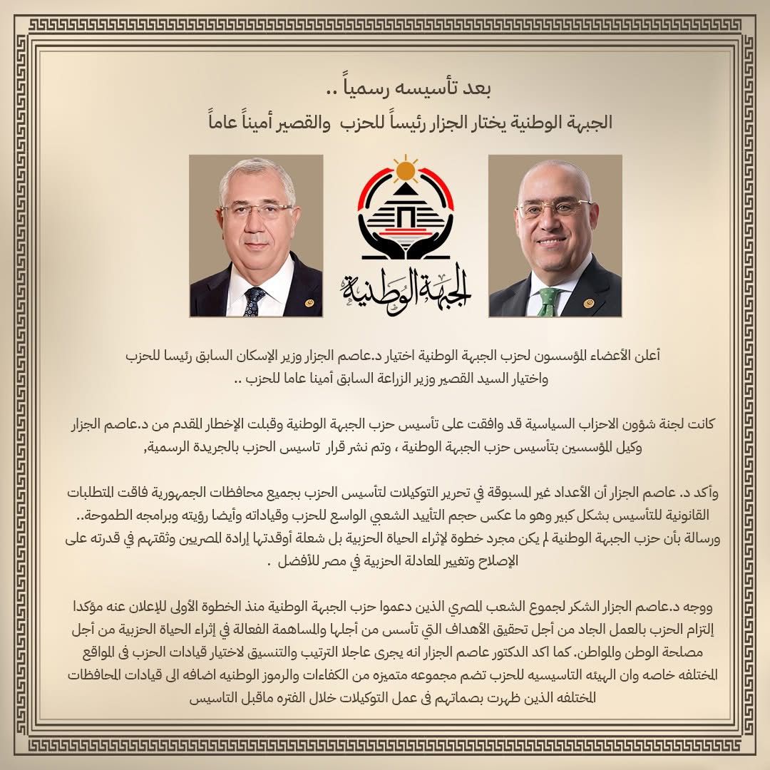 أعلن الأعضاء المؤسسون لحزب الجبهة الوطنية اختيار د. عاصم الجزار وزير الإسكان السابق رئيسا للحزب واختيار السيد القصير وزير الزراعة السابق أمينا عاما للحزب.