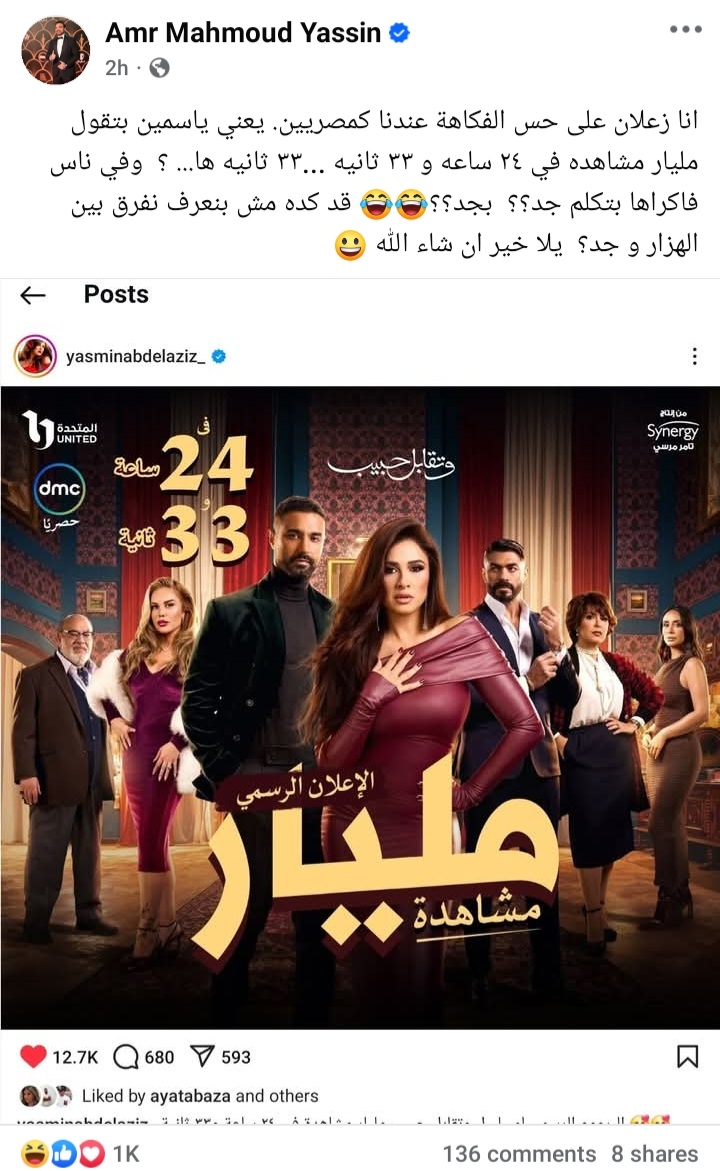 وكتب عمرو محمود ياسين عبر صفحته الرسمية “ فيس بوك ” "أنا زعلان على حس الفكاهة عندنا كمصريين.. يعني ياسمين بتقول مليار مشاهدة في ٢٤ ساعة و٣٣ ثانية.. ٣٣ ثانية ها؟ وفي ناس فاكراها بتتكلم جد؟ بجد؟ قد كده مش بنعرف نفرق بين الهزار والجد؟ يلا خير إن شاء الله".