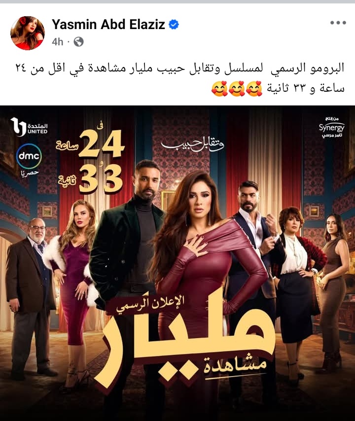 وكانت نشرت ياسمين عبد العزيز صورة للاحتفال بتخطي البرومو الرسمي لمسلسلها لمليار مشاهدة خلال 24 ساعة و٣٣ ثانية وعلقت " البرومو الرسمي لمسلسل وتقابل حبيب مليار مشاهدة في اقل من ٢٤ ساعة ٣٣ ثانية".