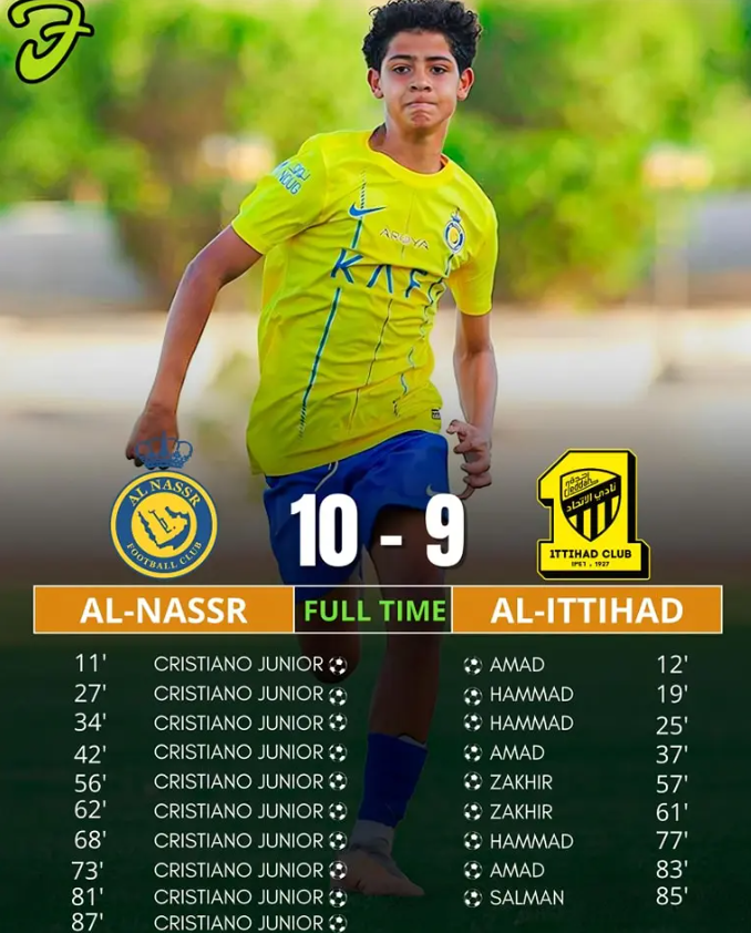 كما انتشرت صورة كذلك لفوز النصر الذي يلعب فيه ابن الأسطورة كريستيانو رونالدو على الاتحاد وأن الفتى الصغير سجل عدداً كبيراً من الأهداف، لكن أحد المسؤولين في الاتحاد السعودي لكرة القدم أشار لمنصة "ذا أثلتيك" إلى أن ذلك غير صحيح، بل إن الاتحاد فاز 4-2 على النصر في مسابقة تحت 15 عاماً، وهو ما أكده متحدث باسم كريستيانو رونالدو الذي قال بأن الأخبار المنتشرة "كذب".