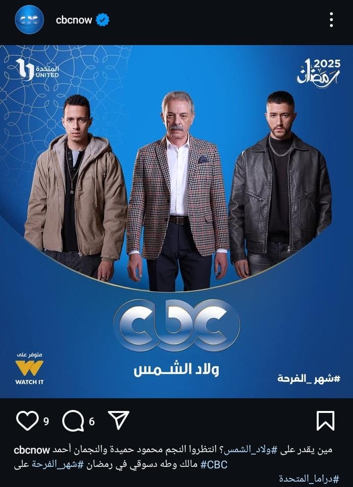 أعلنت شبكة قناة سي بي سي عن عرض مسلسل ولاد الشمس بطولة محمود حميدة و أحمد مالك و طه دسوقي حصريًا علي شاشتها في موسم دراما رمضان 2025، وذلك من خلال حسابها الرسمي عبر موقع تبادل الصور والفديوهات القصيرة “إنستجرام”، وعلقت: “ مين يقدر علي ولاد الشمس؟.. انتظروا النجم محمود حميدة والنجمان أحمد مالك و طه دسوقي في رمضان شهر الفرحة علي CBC”.