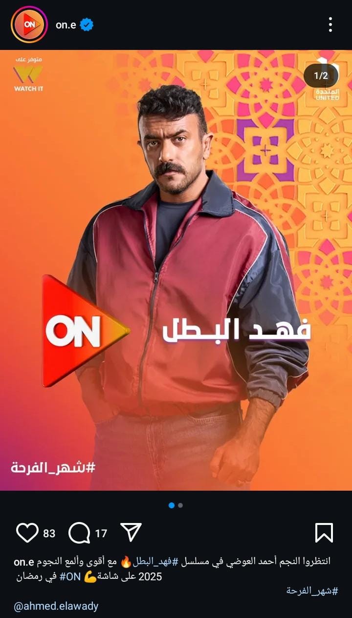 وتواصل شاشة قناة أون الترويج لـ مسلسل فهد البطل بطولة أحمد العوضي، حيث أعلنت قناة أون عن عرض مسلسل فهد البطل حصريًا علي شاشتها ونشرت البوستر الدعائي الخاص بالمسلسل من خلال حسابها الرسمي عبر موقع تبادا الصور والفديوهات القصيرة “إنستجرام”، وعلقت: “ انتظروا النجم أحمد العوضي في مسلسل فهد البطل مع أقوي وألمع النجوم علي شاشة on في رمضان 2025”.