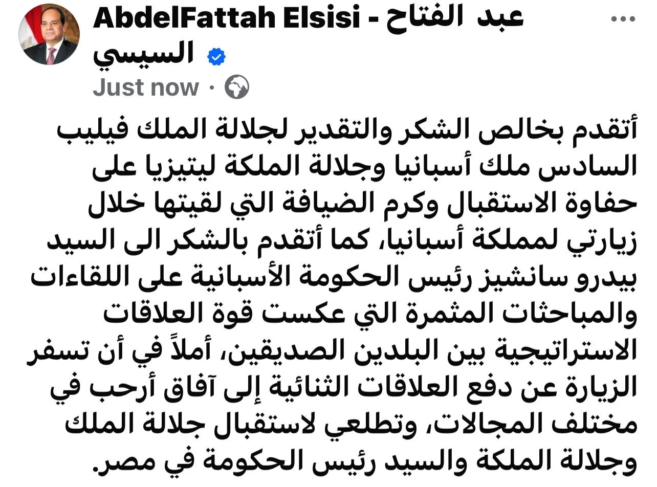 تقدم الرئيس عبد الفتاح السيسى بخالص الشكر والتقدير للملك فيليب السادس ملك أسبانيا والملكة ليتيزيا على حفاوة الاستقبال وكرم الضيافة التي لقيها خلال زيارته لمملكة إسبانيا.