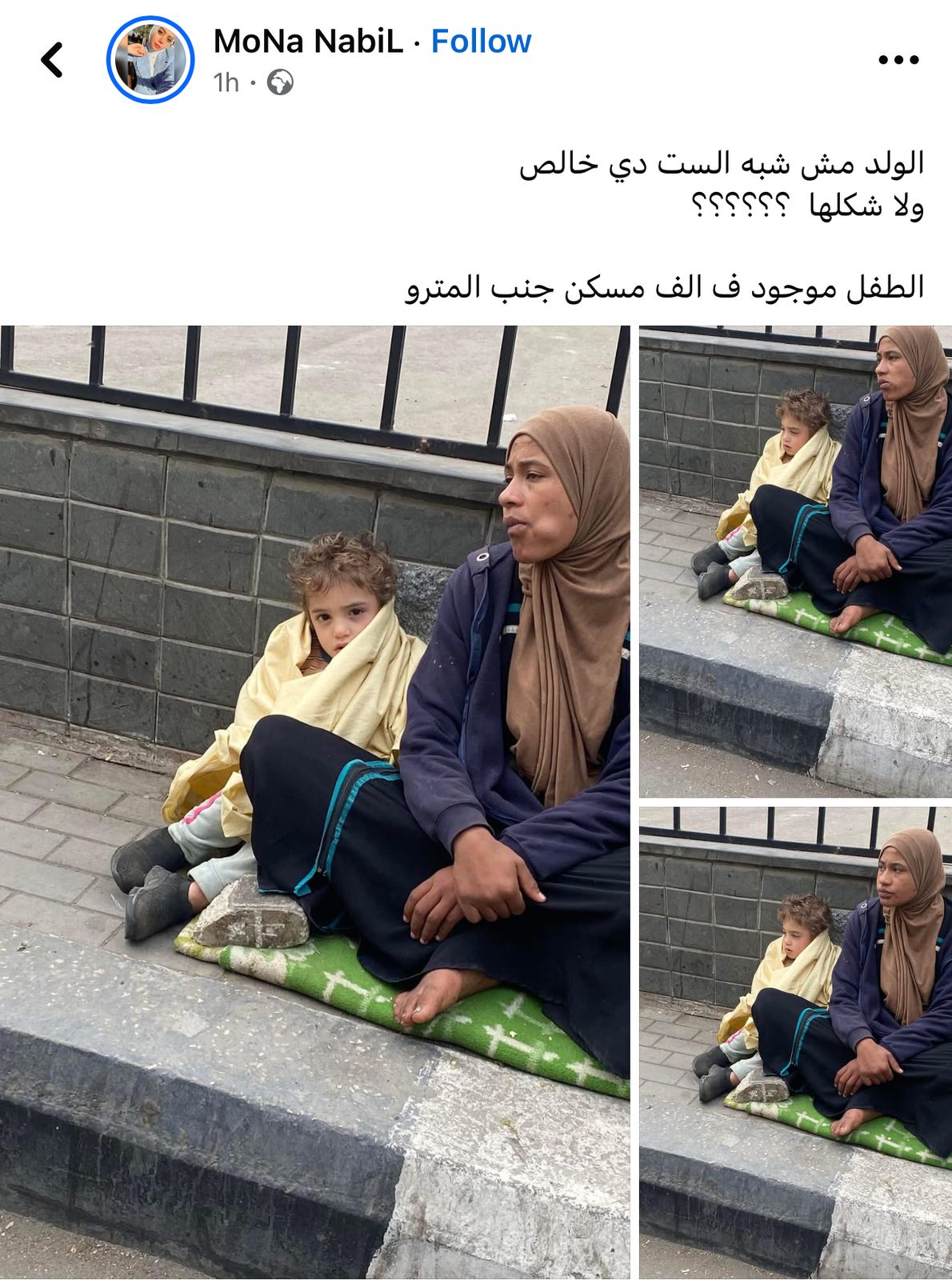 أثارت سيدة " متسولة" فى منطقة ألف مسكن، الريبة بسبب تواجد طفل بجوارها ملامحه لا تشبه ملامحها مما جعل رواد مواقع التواصل الاجتماعي يطالبون الجهات المعنية بالتدخل.