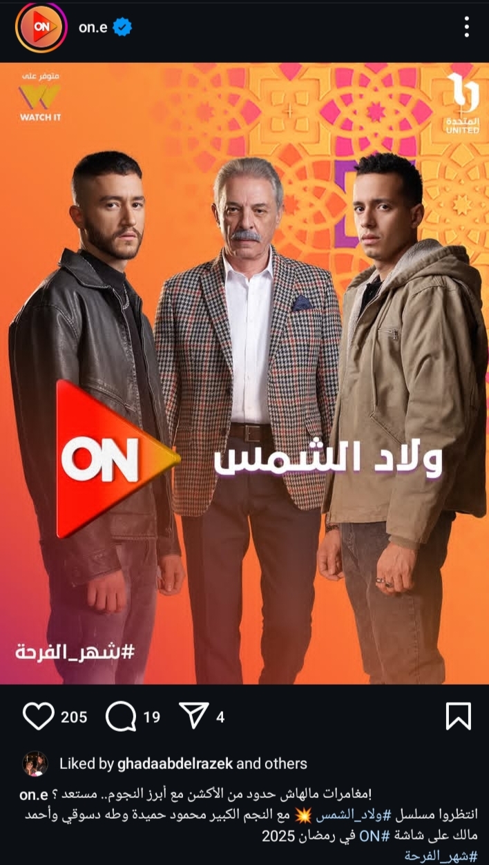 تواصل شاشة قناة أون الترويج لمسلسل ولاد الشمس بطولة محمود حميدة وأحمد مالك وطه دسوقي، استعدادًا لعرض المسلسل ضمن مسلسلات رمضان 2025، وطرحت قناة اون البوستر الرسمي للمسلسل من خلال حسابها الرسمي عبر موقع تبادل الصور والفديوهات القصيرة "إنستجرام"، وعلقت:" مغامرات ملهاش حدود من الأكشن مع أبرز النجوم.. مستعد؟.. انتظروا مسلسل ولاد الشمس مع النجم محمود حميدة وطه دسوقي و أحمد مالك علي شاشة اون في رمضان 2025".