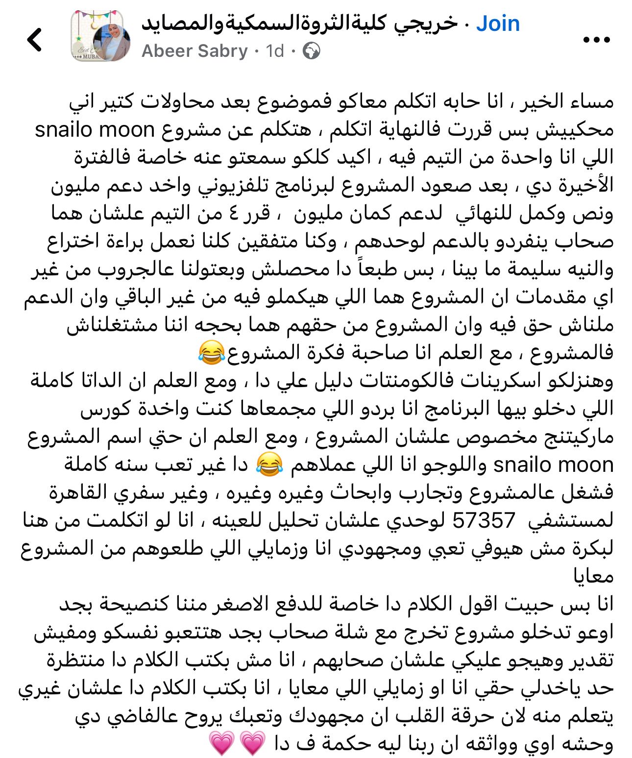 وقالت عبير،" انا حابه اتكلم معاكو فموضوع بعد محاولات كتير اني محكييش بس قررت فالنهاية اتكلم ، هتكلم عن مشروع snailo moon اللي انا واحدة من التيم فيه ، اكيد كلكو سمعتو عنه خاصة فالفترة الأخيرة دي ، بعد صعود المشروع لبرنامج تلفزيوني واخد دعم مليون ونص وكمل للنهائي لدعم كمان مليون ، قرر ٤ من التيم علشان هما صحاب ينفردو بالدعم لوحدهم ، وكنا متفقين كلنا نعمل براءة اختراع والنيه سليمة ما بينا ، بس طبعاً دا محصلش وبعتولنا عالجروب من غير اي مقدمات ان المشروع هما اللي هيكملو فيه من غير الباقي وان الدعم ملناش حق فيه وان المشروع من حقهم هما بحجه اننا مشتغلناش فالمشروع ، مع العلم انا صاحبة فكرة المشروع