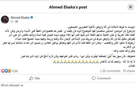 وكتب السقا عبر صفحته الرسمية "فيس بوك" بوست ده موجه لأشقائنا فى الله والوطن الأخوة المصريين المسيحيين بالرجوع إلى البوستين السابقين استحسنوا فهم الموضوع،الولد كان يقصد إن مفيش حد معصوم من الخطأ غير الأنبياء والرسل ولكن لأننا أهملنا لغتنا العربية او حتى العامية تم فهم الكلمة التى كتبها على أنها إلغاء لوجود سيدنا عيسى عليه السلام وتأكيد للعكس، فى حين أنى كمواطن شقيق لكم فى الله والوطن شرط من شروط دينى الإسلامي الإيمان بالله وكتبه ورسله ومنهم سيدنا المسيح عليه السلام.