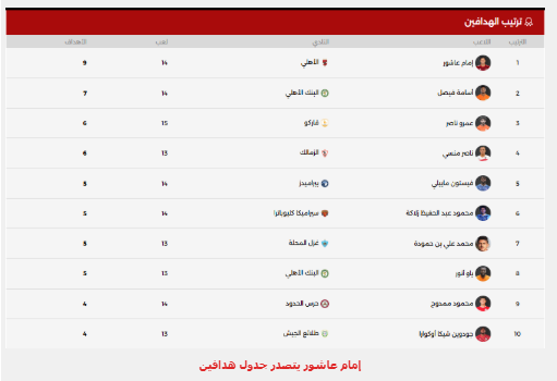 وجاء جدول ترتيب هدافى الدورى المصرى الممتاز "دورى NILE" كالتالي: