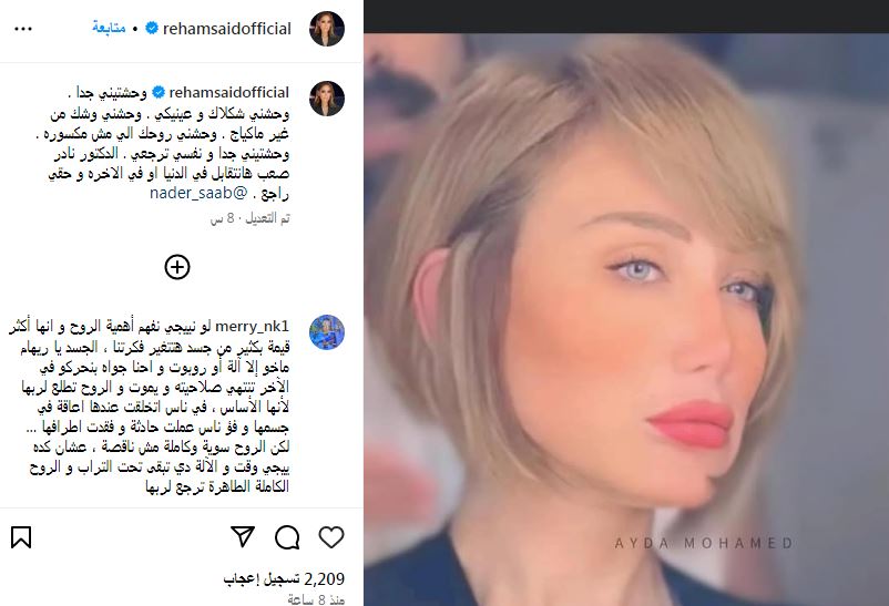 ونشرت ريهام صورة لها قبل عمليات التجميل عبر صفحتها الرسمية "إنستجرام" وقالت في رسالة مؤثرة " وحشتيني جدا . وحشني شكلك و عينيكي . وحشني وشك من غير ماكياج . وحشني روحك الي مش مكسوره . وحشتيني جدا و نفسي ترجع . الدكتور نادر صعب هانتقابل في الدنيا او في الاخره و حقي راجع .