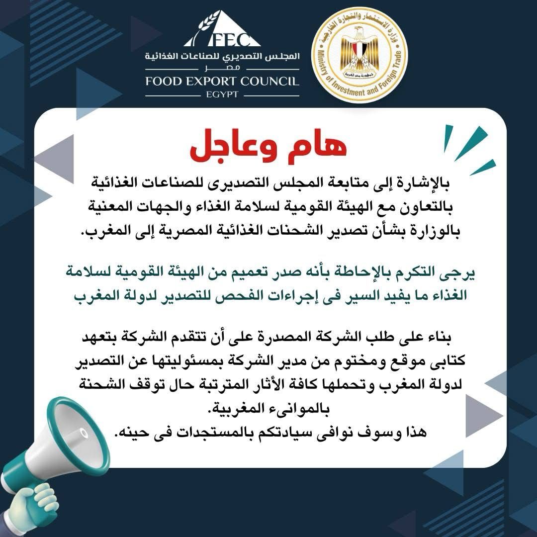 أعلن المجلس التصديري للصناعات الغذائية ، صدور تعميم من الهيئة القومية لسلامة الغذاء يفيد بالسير فى إجراءات الفحص للتصدير لدولة المغرب.