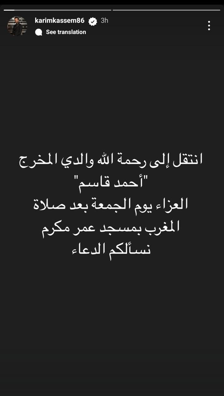 حيث أعلن الفنان كريم قاسم عن موعد ومكان العزاء، وذلك من خلال حسابه الرسمي عبر موقع تبادل الصور والفديوهات القصيرة “إنستجرام”، وعلق: “ انتقل إلي رحمة الله والدي المخرج أحمد قاسم.. العزاء يوم الجمعه بعد صلاة المغرب بمسجد عمر مكرم نسألكم الدعاء”.