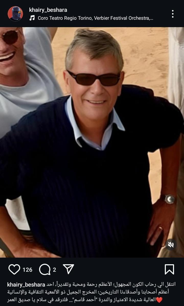 حرص عدد كبير من نجوم الفن علي تنعية المخرج الراحل أحمد قاسم، والد الفنان كريم قاسم، الذي رحل عن عالمنا في الساعات القليلة الماضية، وكان أولهم المخرج خيري بشارة الذي أعلن عن وفاة صديقه، حيث نشر صورة له من خلال حسابه الرسمي عبر موقع تبادل الصور والفيديوهات القصيرة “إنستجرام”، وعلق: “ انتقل الي رحاب الكون المجهول، الأعظم رحمة ومحبة وتقديرًا، احد أعظم أصحابنا و أصدقاءنا التاريخين، المخجر الجميل ذو الألمعية الثقافية والإنسانية العالية شديدة الامتياز والندرة “أحمد فاسم”.. فلترقد في سلام يا صديق العمر".