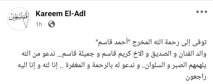 بينما نشر المخرج كريم العدل عبر حسابه الرسمي علي موقع التواصل الإجتماعي “فيسبوك”، وكتب: “ توفي إلي رحمة الله المخرج أحمد قاسم والد الفنان والصديق والاخ كريم قاسم وجميلة قاسم.. ندعو من الله يلهمهم الصبر والسلوان.. وندعو له بالرحمة والمغفرة.. إنا لله و إنا اليه راجعون”.