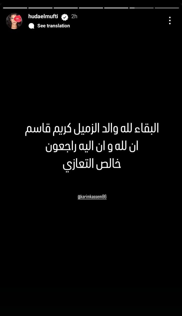 وحرصت الفنانة هدي المفتي تقديم التعزية للفنان كريم قاسم، ونشرت عبر حسابها الرسمي عبر موقع تبادل الصور والفيديوهات القصيرة “إنستجرام”، عبر خاصية استوري، وكتبت: “البقاء لله والد الزميل كريم قاسم ان لله و ان اليه راجعون خالص التعازي”.