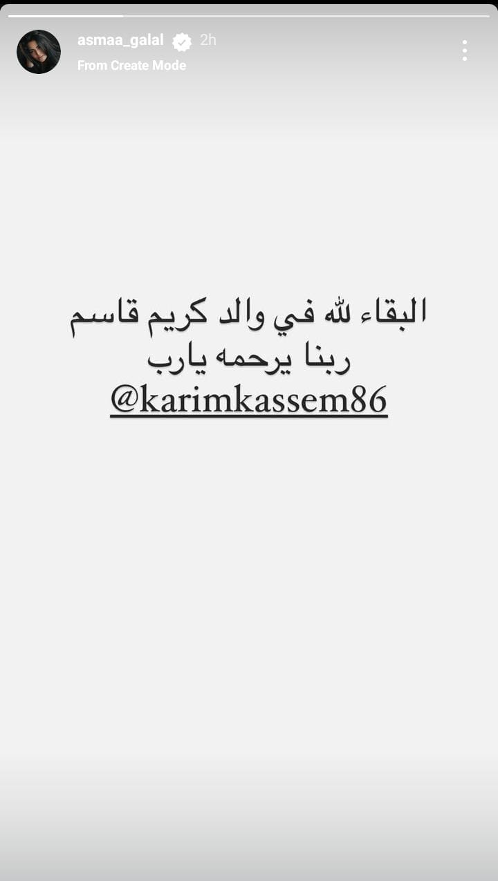 ونشرت الفنانة أسماء جلال من خلال حسابها الرسمي عبر موقع تبادل الصور والفيديوهات القصيرة “إنستجرام”، عبر خاصية استوري، وكتبت: “ البقاء لله في والد كريم قاسم ربنا يرحمه يارب”.
