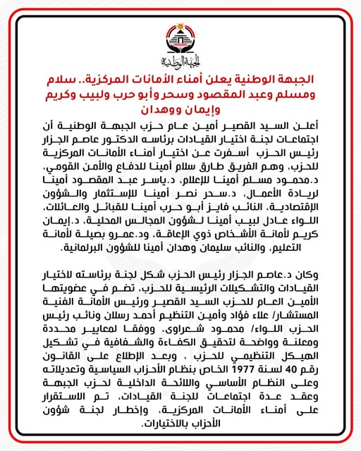 أعلن السيد القصير أمين عام حزب الجبهة الوطنية أن اجتماعات لجنة اختيار القيادات برئاسة الدكتور عاصم الجزار رئيس الحزب أسفرت عن اختيار أمناء الأمانات المركزية للحزب.