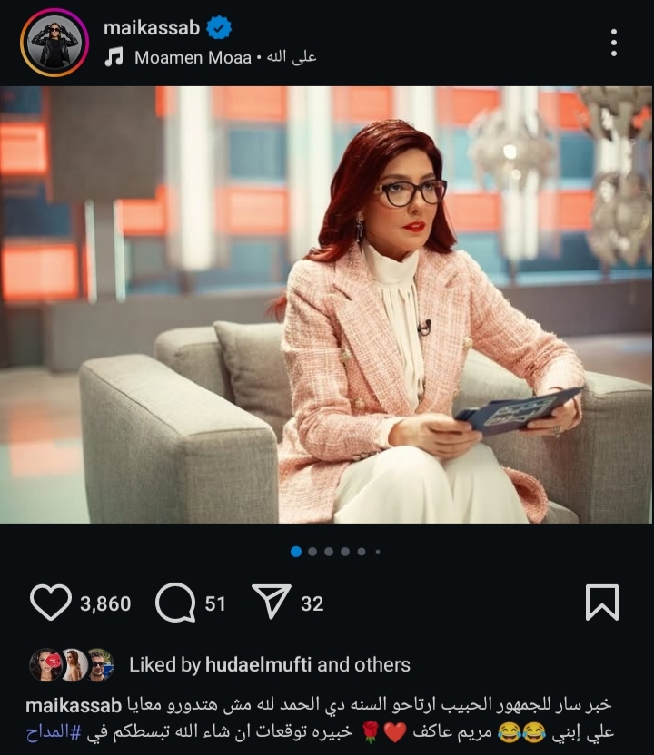 وشاركت مي كساب جمهورها صور من كواليس تصوير مسلسل المداح إسطورة العهد، وذلك من خلال حسابها الرسمي عبر موقع تبادل الصور والفديوهات القصيرة "إنستجرام"، وعلقت:" خبر سار للجمهور الحبيب ارتاحو السنه دي الحمد لله مش هتدورو معايا علي إبني.. مريم عاكف خبيرة توقعات ان شاء الله تبسطكم في المداح".