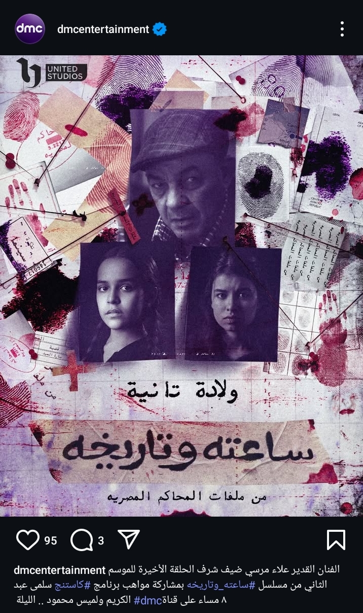 أعلنت شاشة قناة دي إم سي عن موعد عرض الحلقة 16 من مسلسل ساعته وتاريخه 2، حيث نشرت البوستر الرسمي لحلقة اليوم من خلال حسابها الرسمي عبر موقع تبادل الصور والفديوهات القصيرة "إنستجرام"، وعلقت:" الفنان القدير علاء مرسي ضيف شرف الحلقة الأخيرة للموسم الثاني من مسلسل ساعته وتاريخه بمشاركة مواهب برنامج كاستنج سلمي عبد الكريم ولميس محمود.. الليلة 8 مساء علي قناة Dmc".