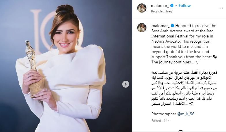 شاركت الفنانة مي عمر جمهورها صور من احتفالها بحصولها على جائزة أفضل ممثلة عربية من مهرجان العراق الدولي،وذلك عن مسلسل "نعمة الأفوكاتو" الذي تم عرضه خلال شهر رمضان الماضي 2024 .