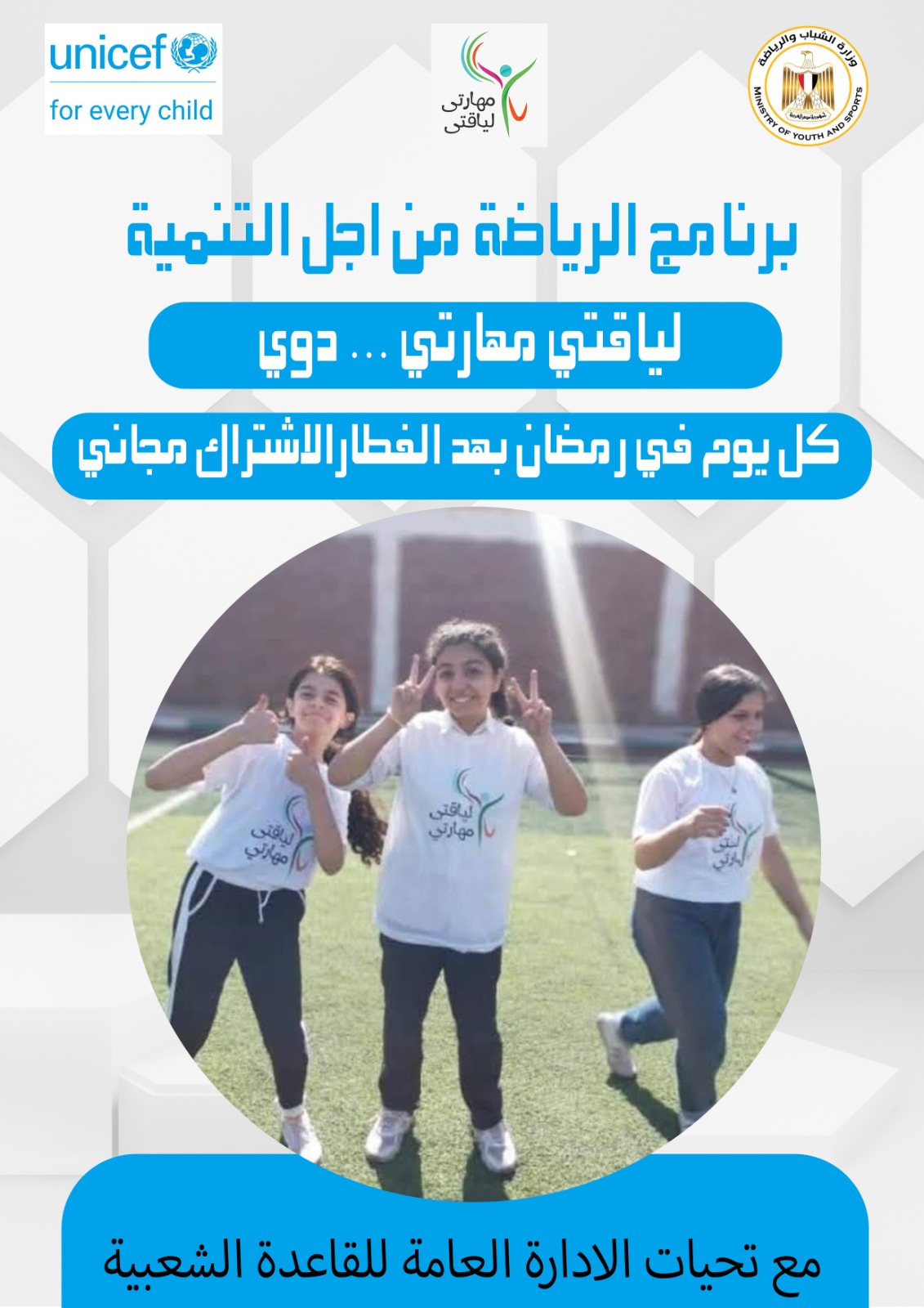 تعلن وزارة الشباب والرياضة "الإدارة المركزية للتنمية الرياضية"، بالتعاون مع منظمة اليونيسف، عن انطلاق برنامج "الرياضة من أجل التنمية – لياقتي مهارتي. دوي"، والذي سيتم تنفيذه يوميًا خلال شهر رمضان في 10 محافظات مختلفة على مستوى الجمهورية،ويأتي ذلك في إطار جهودها لنشر ثقافة الرياضة وتعزيز التنمية المستدامة.