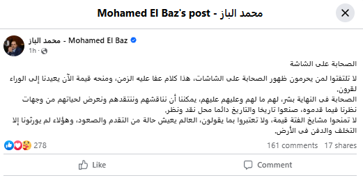 أضاف الباز، عبر حسابه الرسمي على منصة “ فيسبوك”: "لا تلتفتوا لمَن يحرّمون ظهور الصحابة على الشاشات، هذا كلام عفا عليه الزمن، ومنحه قيمة الآن يعيدنا إلى الوراء لقرون".
