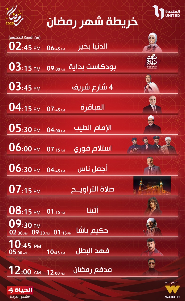 وذكرت "الحياة" أن البرنامج الديني "الدنيا بخير"، سيذاع يوميا الساعة 2.45 دقيقة ظهرًا، وبرنامج "بود كاست بداية" الساعة 3.15 عصرًا، وبرنامج "4 شارع شريف"، الساعة 3.45 عصرًا.