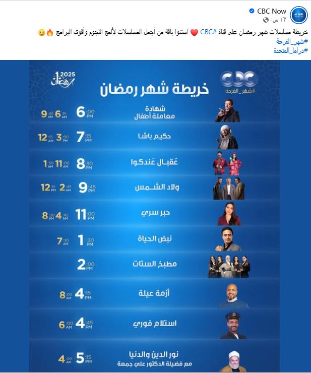 أعلنت شبكة قنوات cbc عن خريطة عرض مسلسلات وبرامج رمضان التي تعرض عبر شاشتها خلال شهر رمضان 2025.