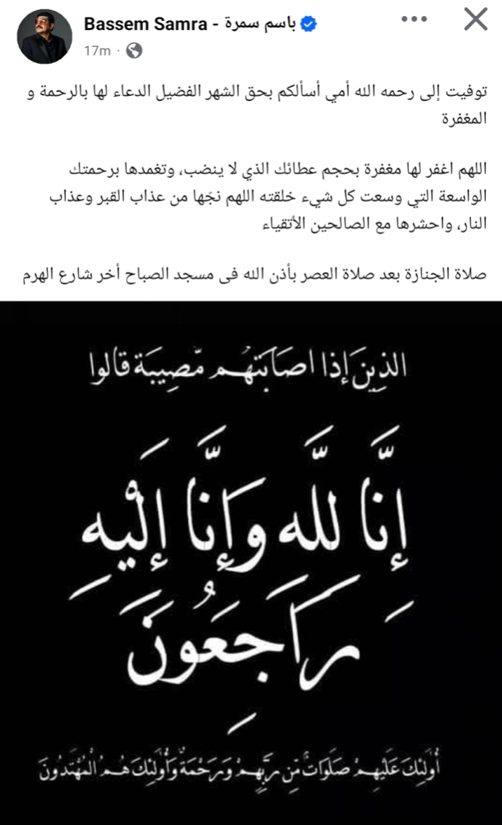 وأعلن الفنان باسم سمرة عن وفاة والدته، وذلك من خلال منشور عبر صفحته الرسمية عبر موقع التواصل الاجتماعي "فيسبوك"، وعلق:"توفيت إلى رحمه الله أمي أسألكم بحق الشهر الفضيل الدعاء لها بالرحمة و المغفرة"