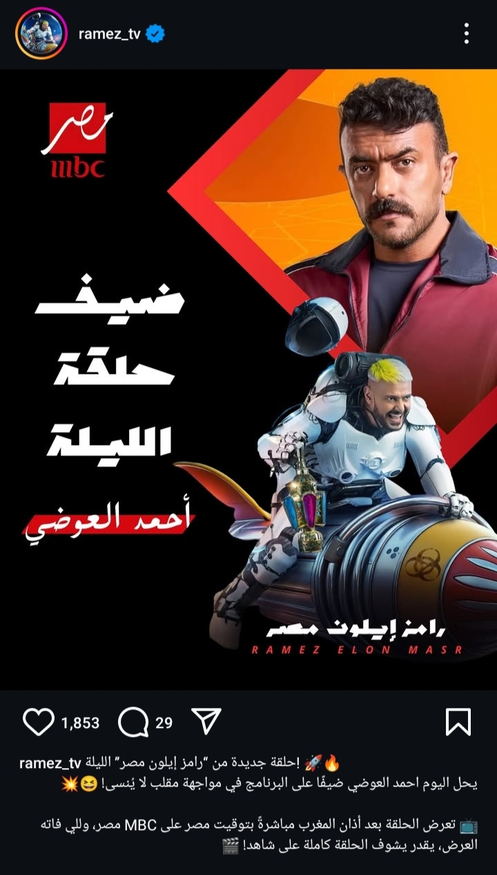 وأعلن الفنان رامز جلال عن استضافته للفنان أحمد العوضي، وذلك من خلال حسابه الرسمي عبر موقع تبادل الصور والفيديوهات القصيرة "إنستجرام"، وعلق: "حلقة جديدة من رامز إيلون مصر الليلة.. يحل اليوم احمد العوضي ضيفًا علي البرنامج في مواجهه مقلب لا ينسي!".