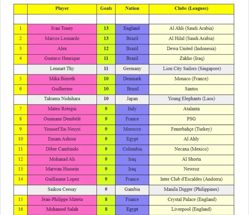 يتواجد إمام عاشور لاعب الأهلي فى المركز العاشر برصيد 9 أهداف، والدولي المصري محمد صلاح لاعب ليفربول الإنجليزي فى المركز 16 بتسجيله 8 أهداف.