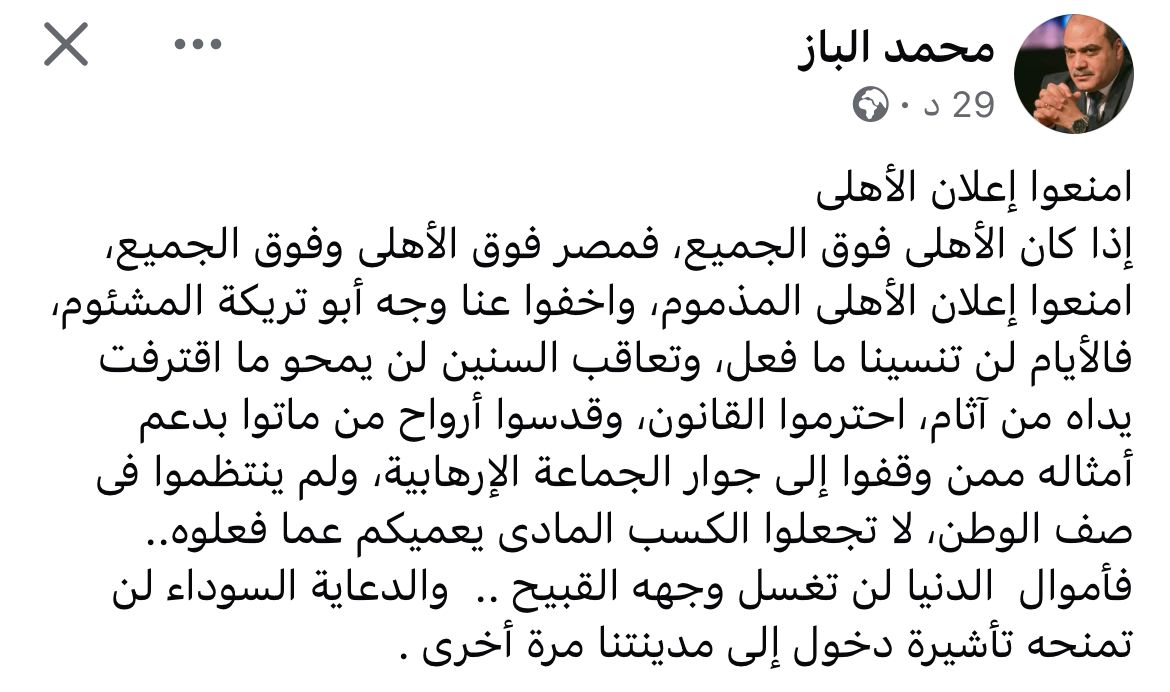 وكتب الدكتور محمد الباز، رئيس مجلسي إدارة وتحرير جريدة الدستور، عبر صفحته الرسمية على "فيسبوك": امنعوا إعلان الأهلي، إذا كان الأهلي فوق الجميع، فمصر فوق الأهلي وفوق الجميع، امنعوا إعلان الأهلي المذموم، واخفوا عنا وجه أبو تريكة المشئوم، فلأيام لن تنسينا ما فعله وتعاقب السنين لن يمحوا ما اقترفت يداه من آثام.