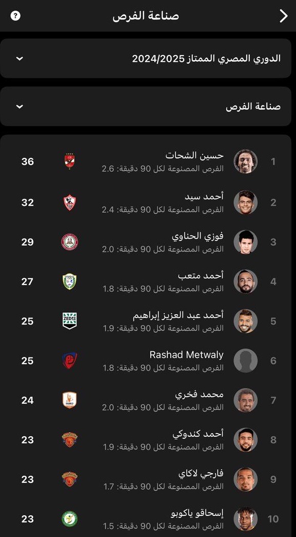 فيما كان ترتيب فوزي الحناوي الثالث بين نجوم الدوري الممتاز في صناعة الفرص، حيث نجح في خلق 29 فرصة خلال 16 مباراة، بمعدل فرصتين لكل 90 دقيقة.
