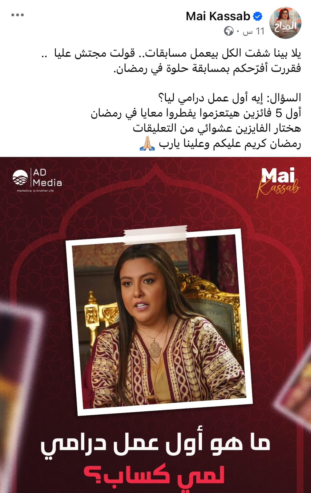 وأعلنت مي كساب عن المسابقة من خلال حسابها الرسمي عبر موقع التواصل الاجتماعي "فيسبوك"، وكتبت:" يلا بينا شفت الكل بيعمل مسابقات.. قولت مجتش عليا .. فقررت أفرّحكم بمسابقة حلوة في رمضان.