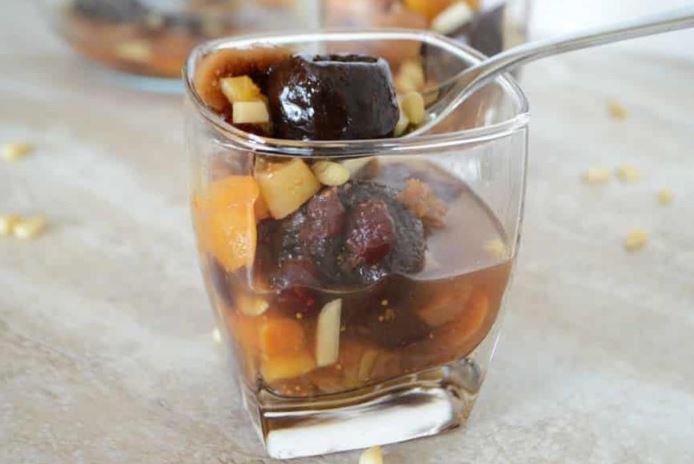 ضعى البلح فى الماء، وقومى بتقطيع المشمشية والتين قطع متوسطة الحجم واضيفيها مع البلح.