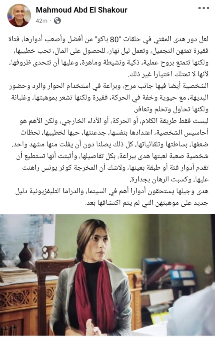 وكتب محمود عبد الشكور عبر حسابه الرسمي علي موقع التواصل الاجتماعي "فيسبوك"، وقال:" لعل دور هدى المفتي في حلقات "80 باكو" من أفضل وأصعب أدوارها، فتاة فقيرة تمتهن التجميل، وتعمل ليل نهار، للحصول على المال، تحب خطيبها، ولكنها تتمتع بروح عملية، ذكية ونشيطة وماهرة، وعليها أن تتحدى ظروفها، لأنها لا تمتلك اختيارا غير ذلك.