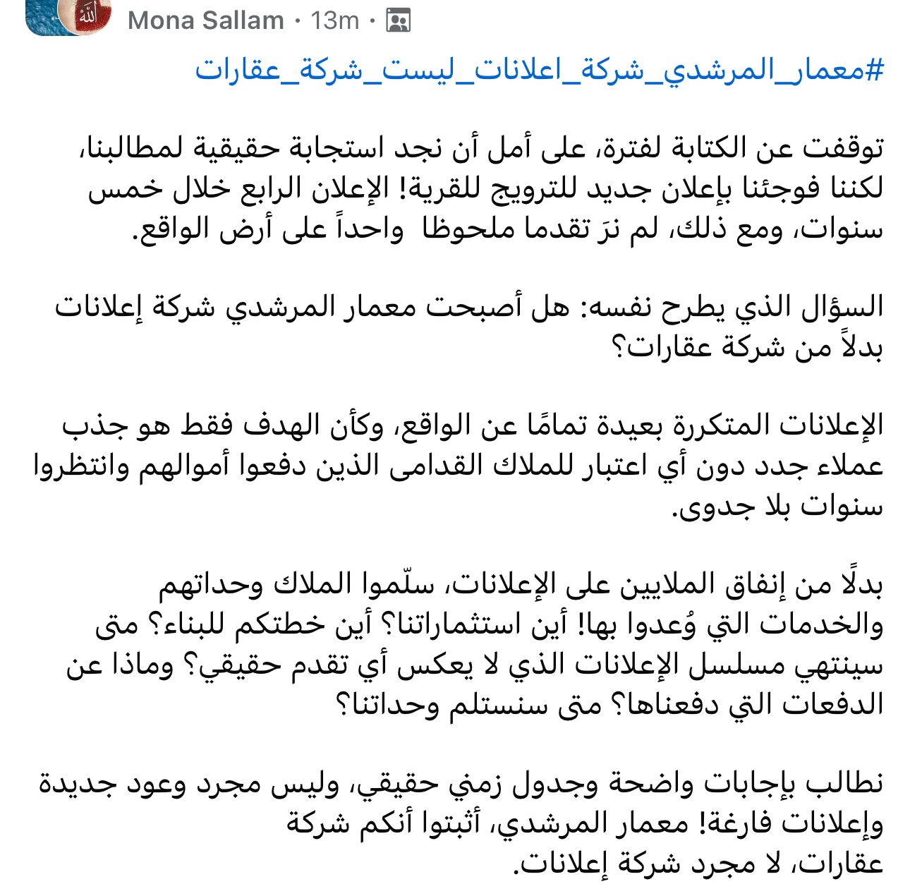 وتابعت،" السؤال الذي يطرح نفسه: هل أصبحت معمار المرشدي شركة إعلانات بدلاً من شركة عقارات؟ الإعلانات المتكررة بعيدة تمامًا عن الواقع، وكأن الهدف فقط هو جذب عملاء جدد دون أي اعتبار للملاك القدامى الذين دفعوا أموالهم وانتظروا سنوات بلا جدوى".