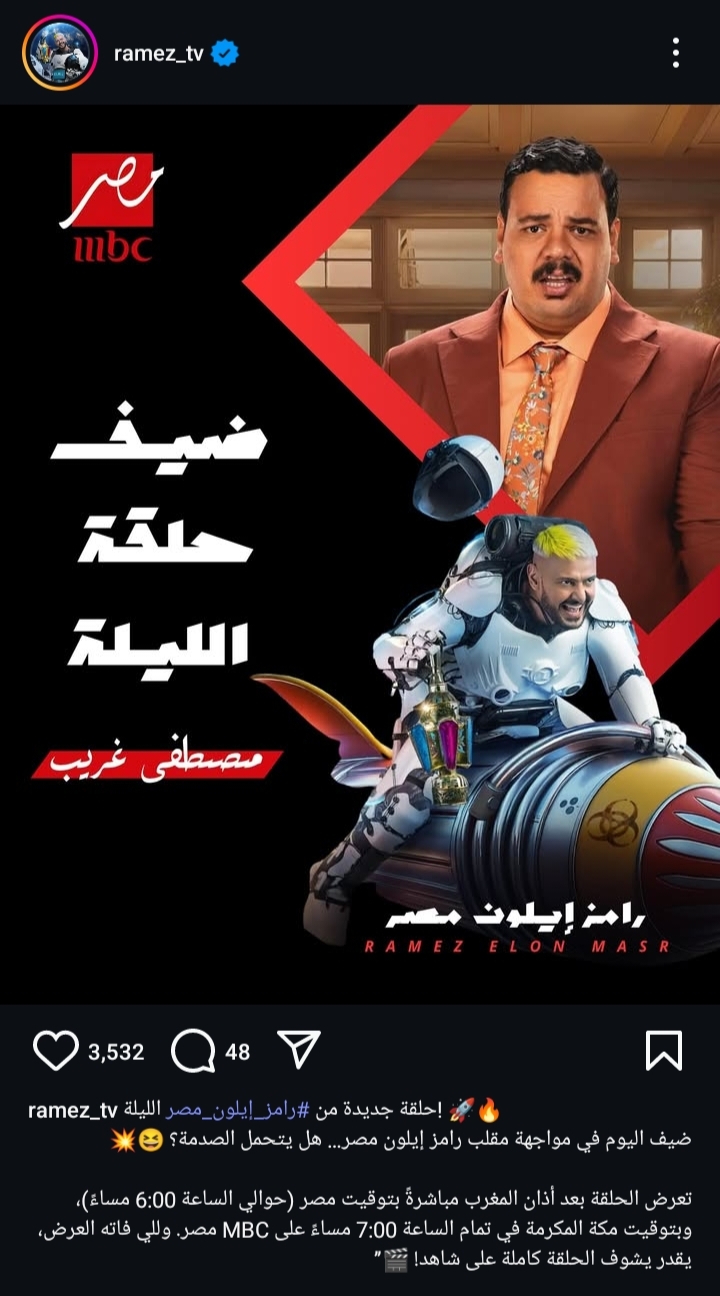 وأعلن الفنان رامز جلال عن استضافته لـ مصطفي غريب، وذلك من خلال حسابه الرسمي عبر موقع تبادل الصور والفيديوهات القصيرة "إنستجرام"، وعلق: ““حلقة جديدة من رامز إيلون مصر الليلة .. ضيف اليوم في مواجة مقلب رامز إيلون مصر .. هل يتحمل الصدمة؟”.