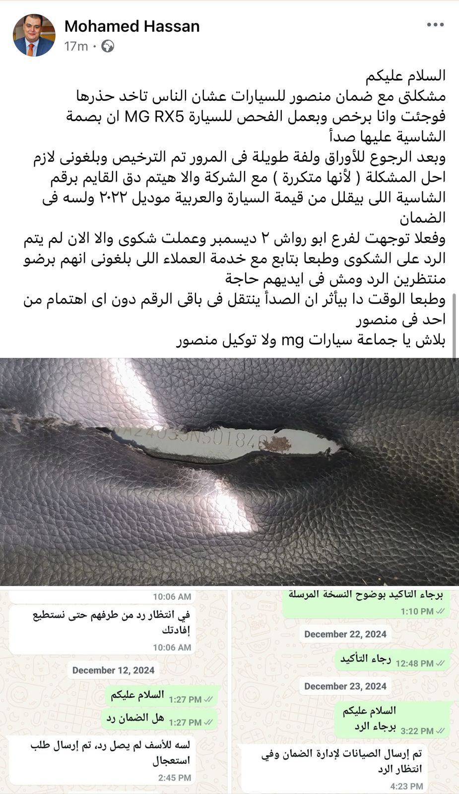 وتابع،" ونتيجة لذلك، لفرع ابو رواش ٢ ديسمبر تعمل والان لم يتم الرد على دولي وطبعا بتابع مع خدمة العملاء بلغلى حدى برضو منتظرين الرد ومش في أيديهم حاجة وطبعا الوقت بي اثر ان الصدأ ينتقل فى باقي الرقم دون أي اهتمام من احد في منصور بلاش يا مجموعة سيارات mg توكيل منصور".