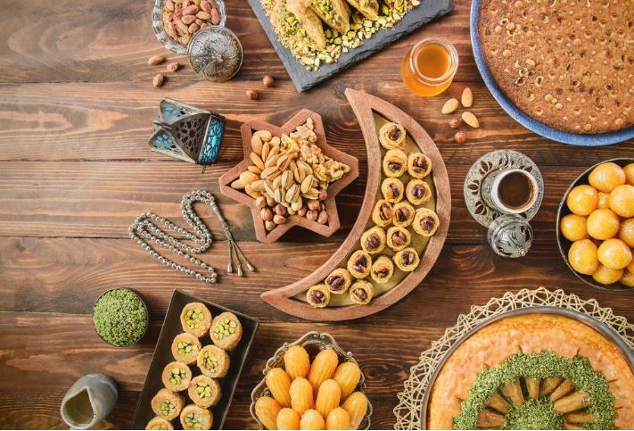 كنافة بالقشطة، بسبوسة ،زلابية ،بلح الشام،قطايف ،جلي ،مهلبية ،أرز بلبن،جلاش، كنافة بالقشطة.