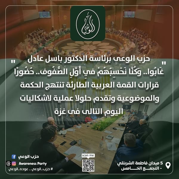 ختامًا: إن حزب الوعي يؤكد التزامه الكامل من واقع دوره الحزبي ورؤيته السياسية والحزبية وتعبيره وتمثيله لأعضائه، بدعم القضية الفلسطينية في كافة المحافل، ويدعو الجميع إلى استلهام روح التضامن العربى في هذه المرحلة الخطيرة ، وتجاوز الخلافات الثانوية، والتركيز على القضايا المصيرية التي ستحدد مستقبل أمتنا.