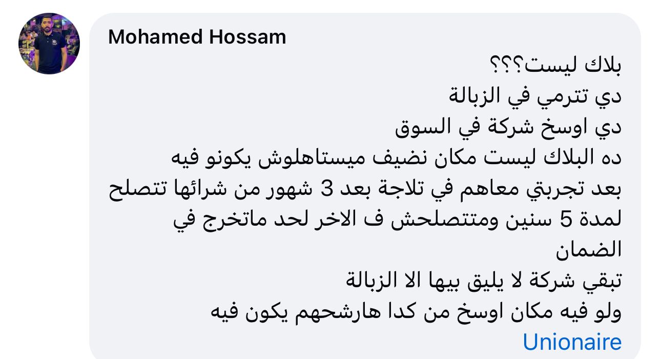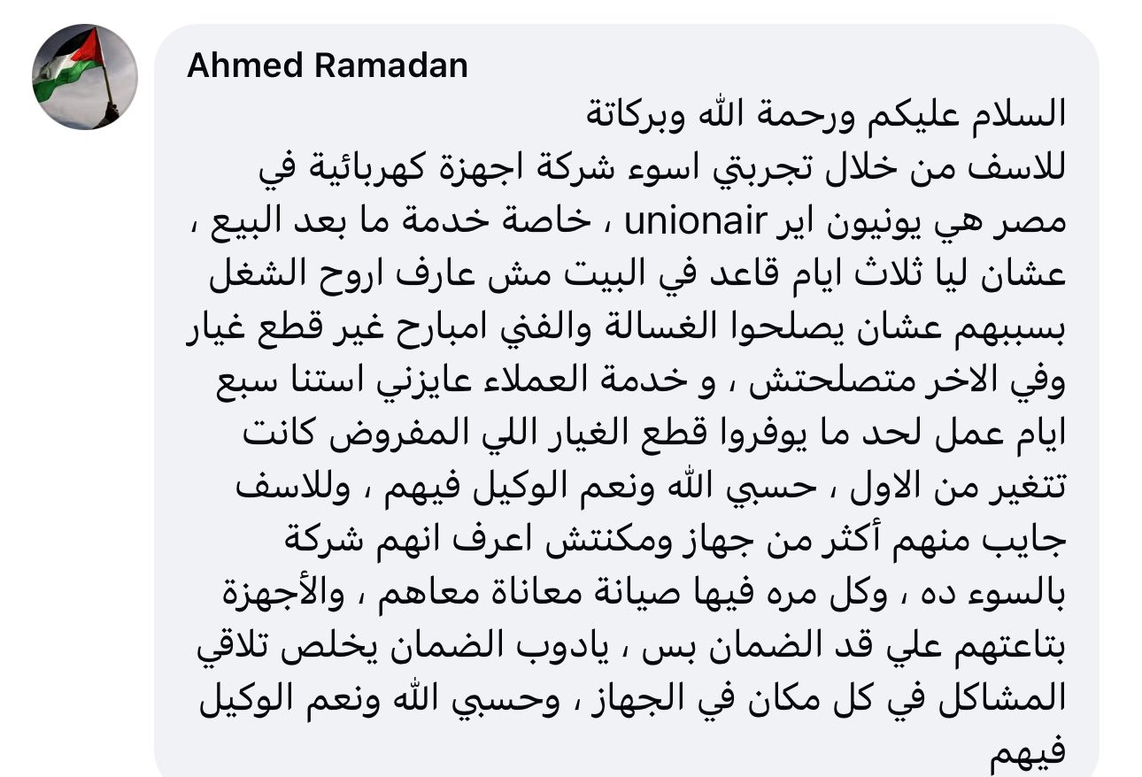 وتابع عميل اخر،"للاسف من خلال تجربتي اسوء شركة اجهزة كهربائية في مصر هي يونيون اير unionair ، خاصة خدمة ما بعد البيع ، عشان ليا ثلاث ايام قاعد في البيت مش عارف اروح الشغل بسببهم عشان يصلحوا الغسالة والفني امبارح غير قطع غيار وفي الاخر متصلحتش ، و خدمة العملاء عايزني استنا سبع ايام عمل لحد ما يوفروا قطع الغيار اللي المفروض كانت تتغير من الاول".