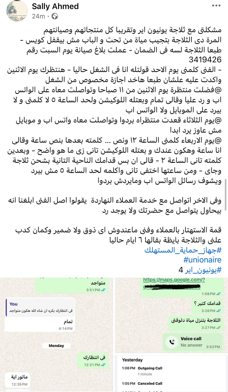 وقالت سيدة مستغيثة بجهاز حماية المستهلك،" مشكلتى مع ثلاجة يونيون آير وتقريبا كل منتجاتهم وصيانتهم المرة دى الثلاجة بتجيب مياه من تحت و الباب مش بيقفل كويس - طبعا الثلاجة لسه فى الضمان - عملت بلاغ صيانة يوم السبت رقم 3419426