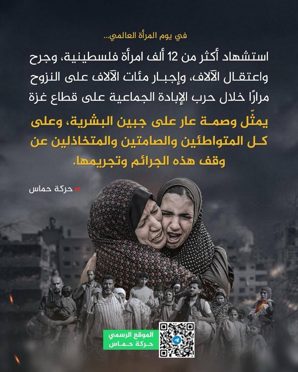 قالت حركة حماس بمناسبة يوم المرأة العالمي إن استشهاد أكثر من 12 ألف امرأة فلسطينية، وجرح واعتقال الآلاف، وإجبار مئات الآلاف على النزوح مرارًا خلال العدوان الصهيوني وحرب الإبادة الجماعية على قطاع غزة، يمثّل وصمة عار على جبين البشرية، وعلى كل المتواطئين والصامتين والمتخاذلين عن وقف هذه الجرائم وتجريمها.