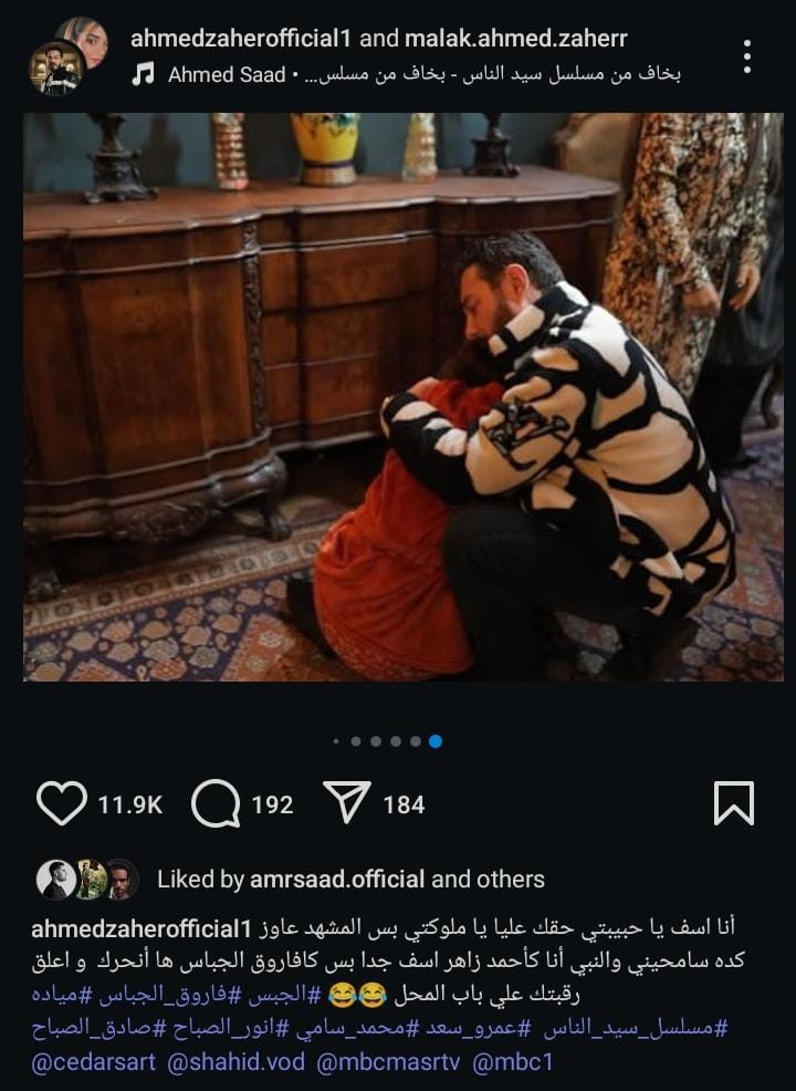 ونشر أحمد زاهر صور من كواليس مشهد ضربه لـ إبنتة في مسلسل سيد الناس، ووجه من خلالها اعتذاره، وذلك من خلال حسابه الرسمي عبر موقع تبادل الصور والفديوهات القصيرة “إنستجرام”، وعلق: “ انا اسف يا حبيبتي حقك عليا يا ملوكتي بس المشهد عاوز كده سامحيني والنبي أنا كأحمد زاهر أسف جدًا بس كافاروق الجباس هأنحرك واعلق رقبتك علي باب المحل”.