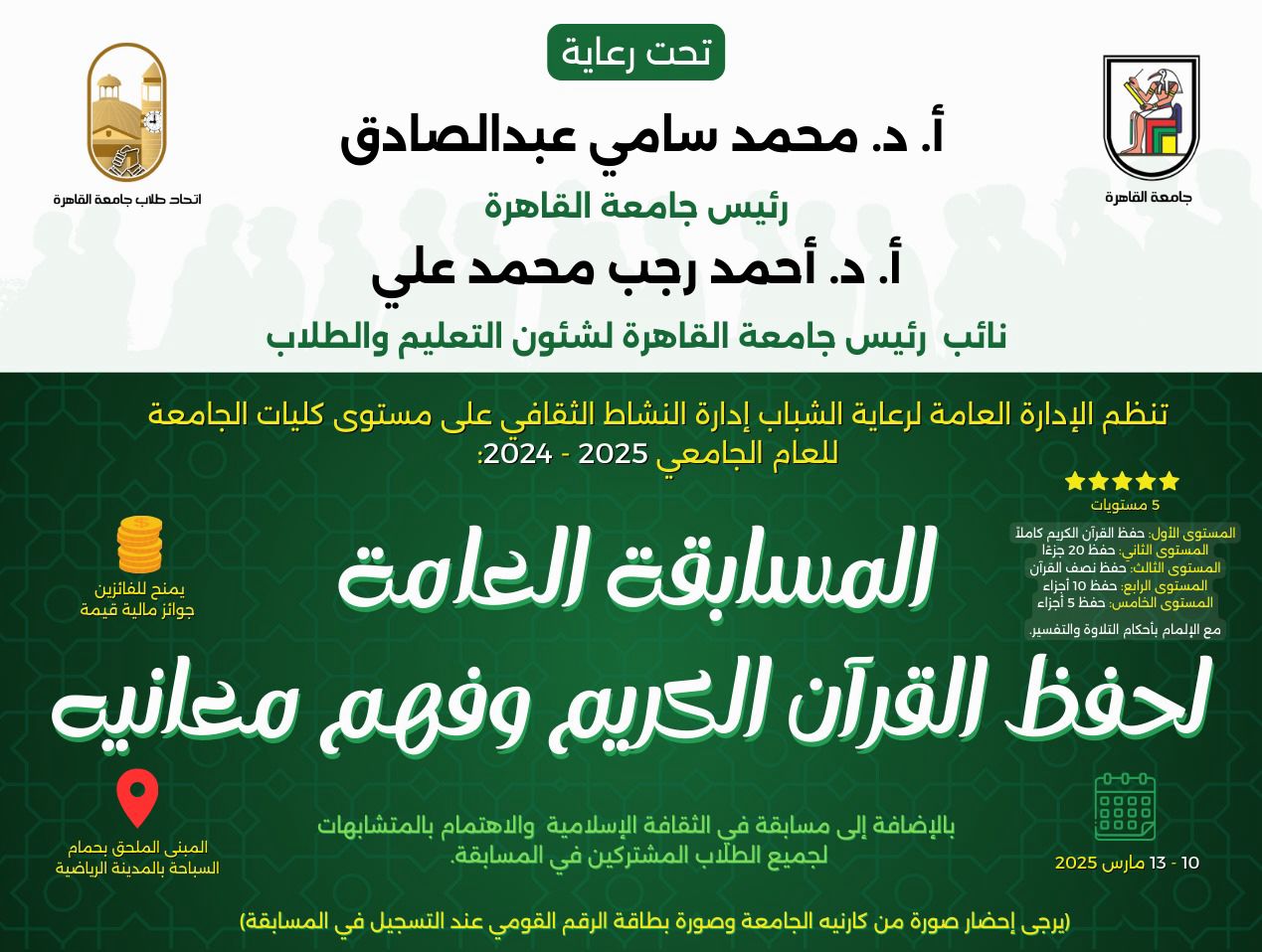 أعلنت الإدارة العامة لرعاية الشباب بجامعة القاهرة، عن إطلاق المسابقة السنوية لحفظ القرآن الكريم وفهم معانيه للعام الجامعي 2025/2024 والتي تُقام خلال الفترة من 10-13 مارس 2025، تحت رعاية الدكتور محمد سامي عبد الصادق رئيس الجامعة، وإشراف الدكتور أحمد رجب نائب رئيس الجامعة لشئون التعليم والطلاب.