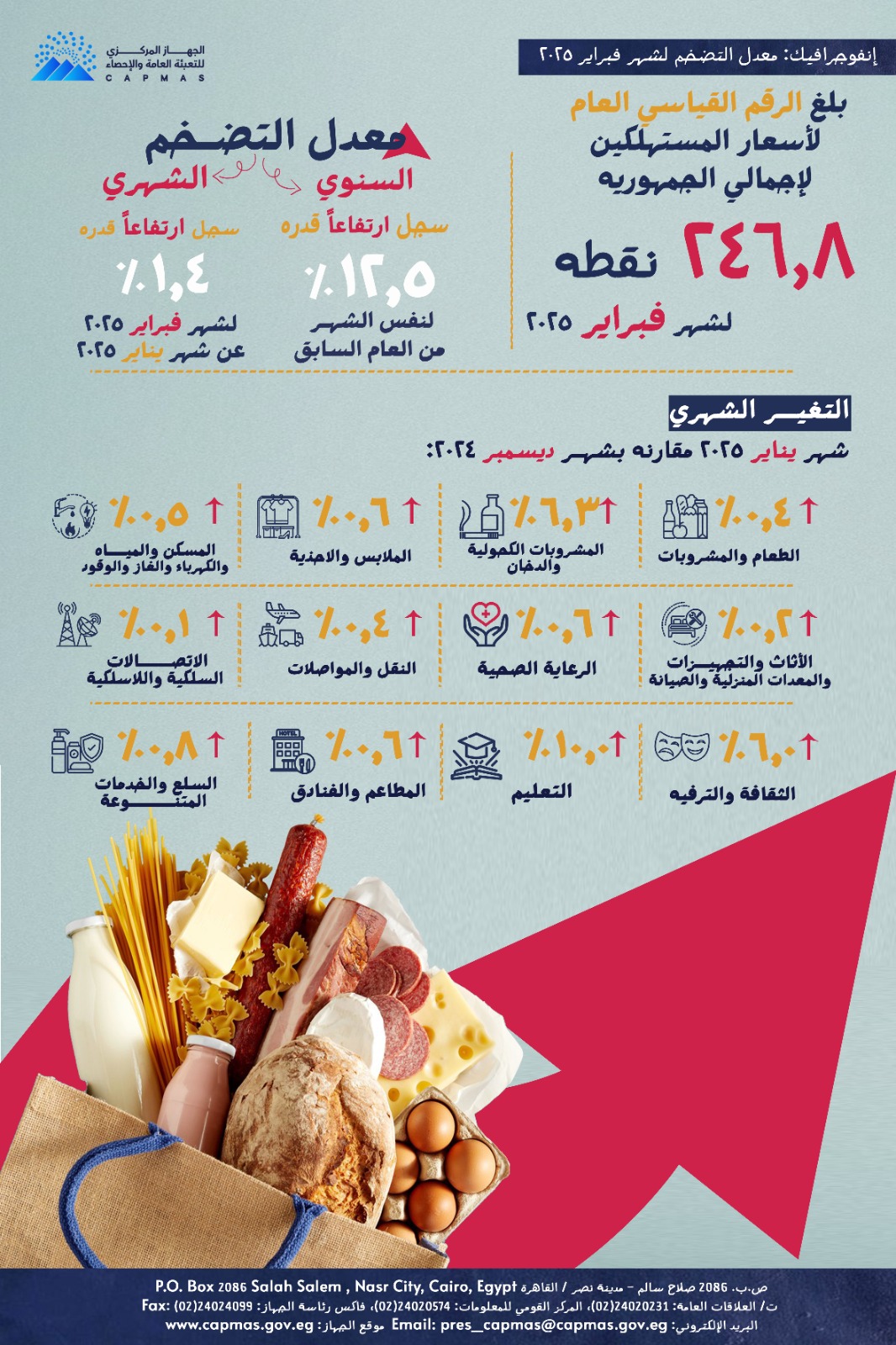 وسجل معدل التضـخم الشهري لإجمالي الجمهورية (1.4%) لشهر فبراير 2025 مقابل (1.6%) شهـر يناير 2025.